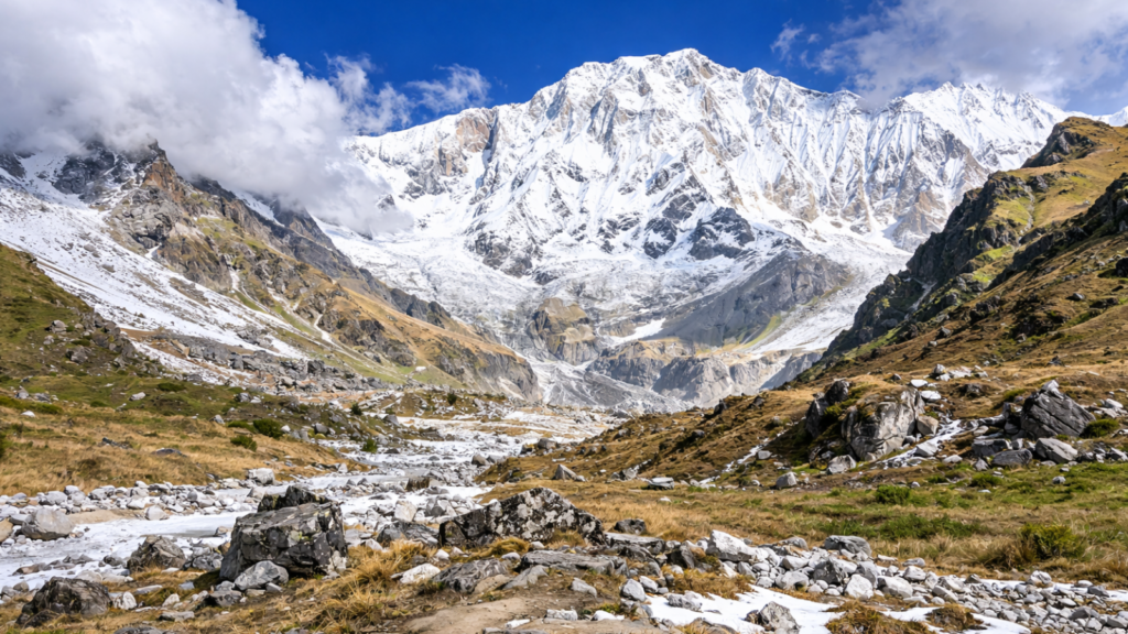 ABC sits on the South Annapurna Glacier moraine, a deposit of rock and sediment left by glacial retreat over the past 60 years. The glacier itself is visible 400 meters above the base camp teahouses, and glaciologists have documented a retreat of 31 meters per year since 2000 in satellite studies of the Annapurna massif. The glacial landscape, blue-gray seracs, crevasse fields, and terminal moraine ridges, forms an active, changing environment that reminds trekkers of ABC’s position within a living glacial system.